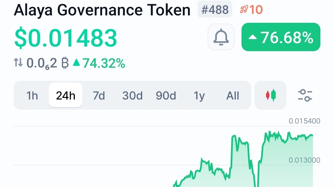 Alaya Governance Token is up 76.86% to $0.0148 in 24h, dramatically outperforming a broadly flat market, primarily driven by a massive surge in speculative trading volume.