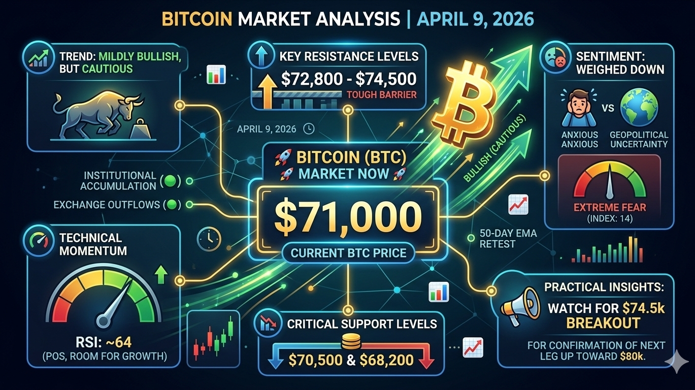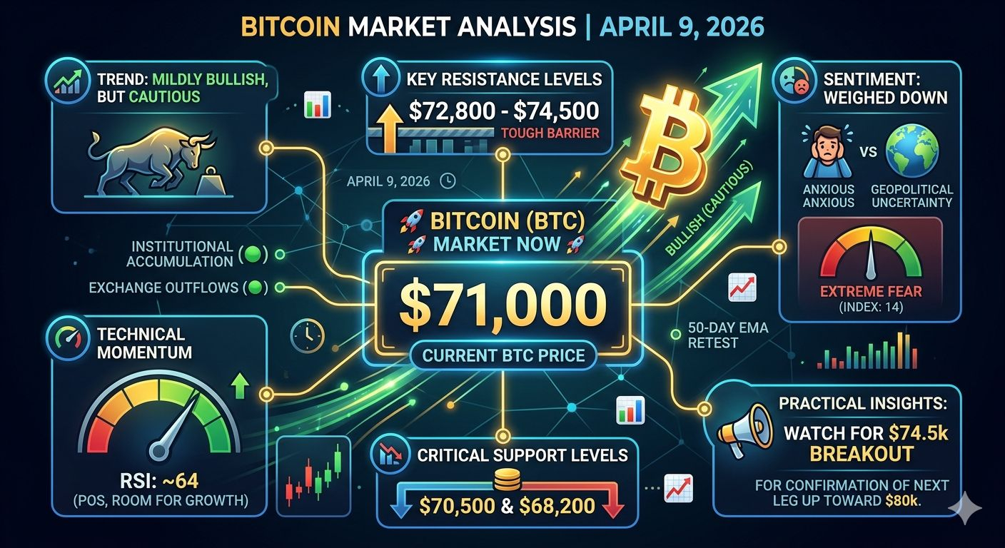As of April 9, 2026, $BTC . Bitcoin is exhibiting a mildly bullish but cautious trend, currently trading near the $71,000 psychological level after a brief retest of the 50-day EMA. Technical momentum is holding positive with an RSI around 64, suggesting room for growth before hitting overbought territory, though immediate resistance at $72,800 – $74,500 remains a tough barrier to break. Critical support is firmly established at $70,500 and $68,200; a sustained close below these could shift the outlook to bearish. While institutional accumulation and exchange outflows signal long-term strength, overall market sentiment is currently weighed down by "Extreme Fear" (index at 14) and geopolitical uncertainty, meaning traders should watch for a high-volume breakout above $74.5k for confirmation of the next leg up toward $80k. 📊📉📈