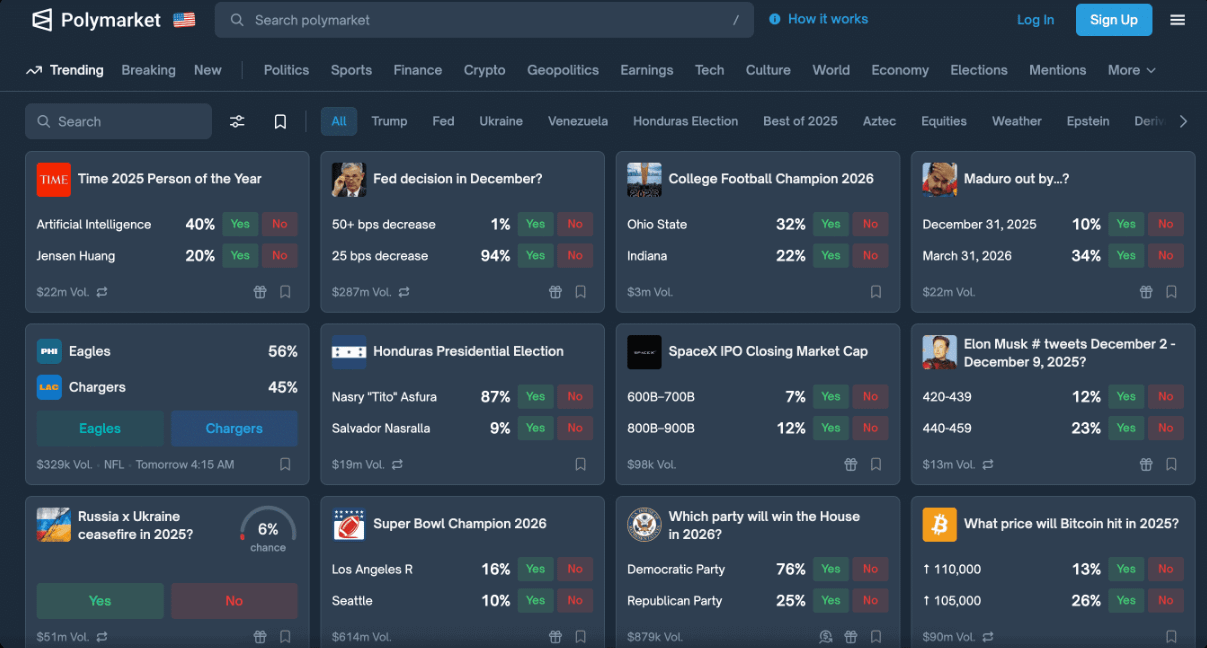 Monthly trading volumes for prediction markets have surged to over $20 billion — up 200-fold in just two years from less than $100 million. Polymarket and Kalshi currently dominate with over 97% of the market.