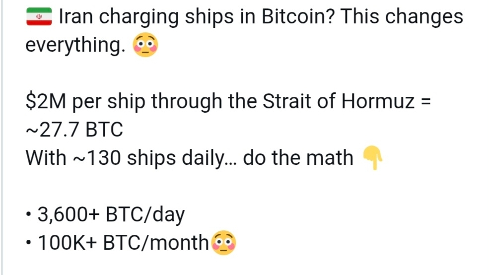 Initially, back in March, it was reported that the fees would be collected in Chinese yuan. However, this has now changed, and these duties—though settled in terms of the dollar equivalent—will be collected in cryptoassets. This refers, of course, to Bitcoin or stablecoins. Tehran wants tankers to pay the equivalent of $1 for each barrel of oil. A full-size VLCC supertanker with a capacity of 2 million barrels would cost around $2 million, which at a BTC exchange rate of around $72,128. (as of April 9th – Bitcoin strengthened amid reports of a ceasefire) would be equivalent to 27.7 BTC.