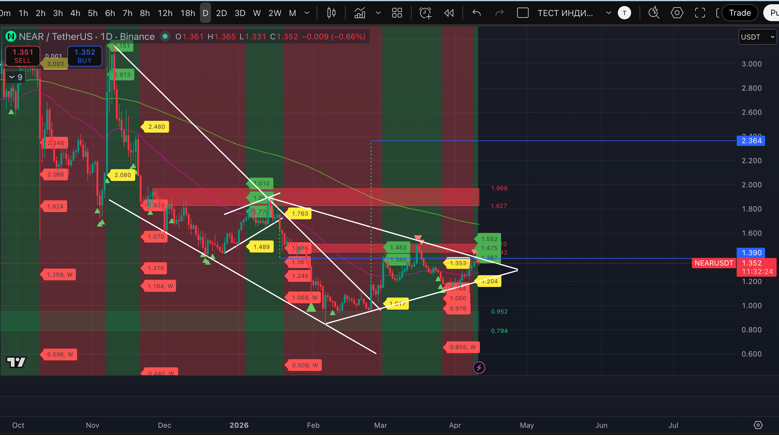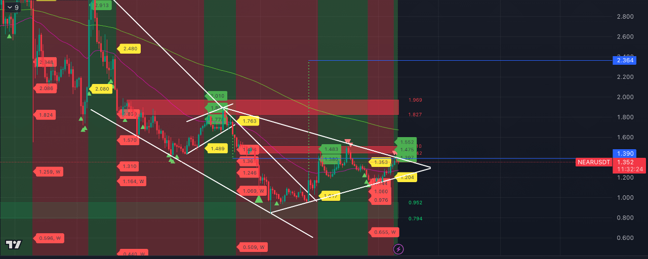 - #NEAR. Цена в процессе отработки "Бычьего клина" с полной целью 2,364$, но начала формировать "Треугольник" и сейчас ожидается выход из него в одну из сторон. Переход в аптренд на дневном ТФ по активу есть, но при этом также есть уже третья метка потенциального хая на этом ТФ. И пока мы бы ждали похода к тесту уровня потенциального слома 1,204$.