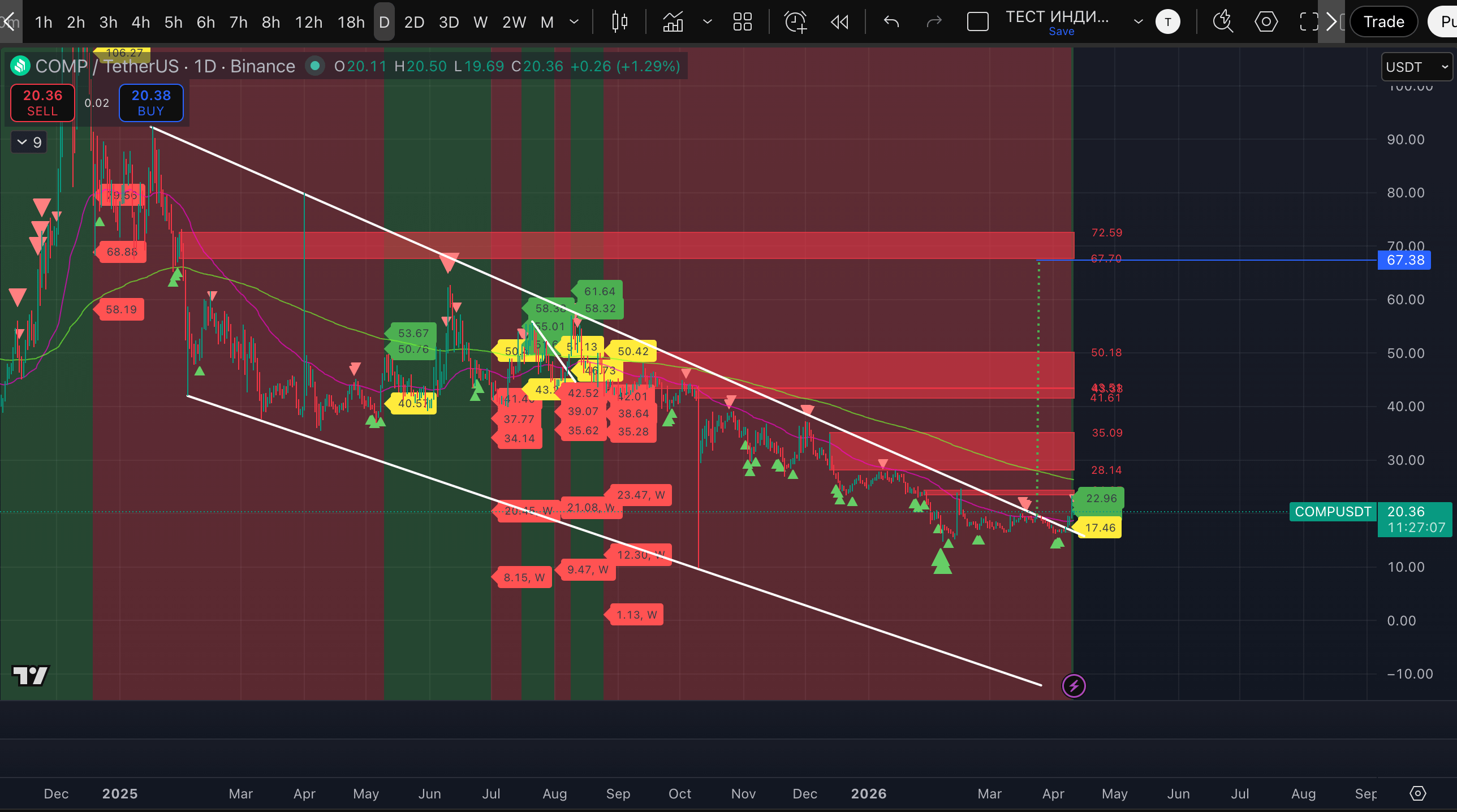 - #COMP. Здесь ситуация интересная тем, что устойчивый аптренд на дневном ТФ у актива - впервые с августа 2025. При этом также есть метки потенциального хая, но важнее что цена вышла из-под трендового сопротивления с 17 января 2025. На графике подобие массивного "Бычьего клина" и если цена осилит полную его отработку - это цель 67,38$. Нужно посмотреть как отработают метки хая на дневном ТФ, есть риск если не возвращения обратно в фигуру, то ретеста выхода из нее. А это, состоянием на сейчас, поход в район 16-17$.