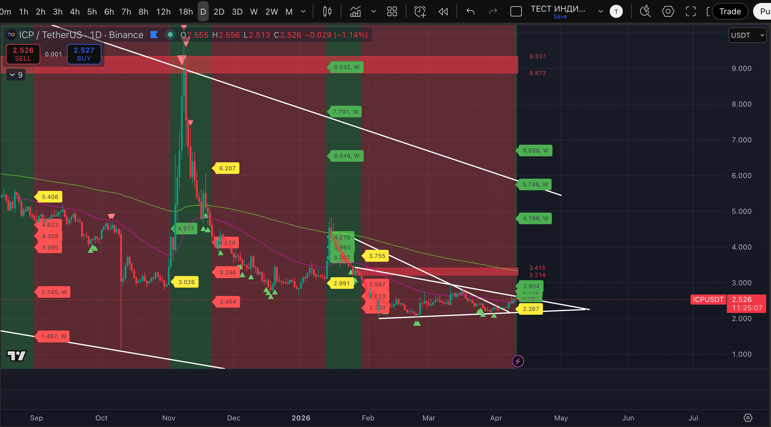 - #ICP. Примечательный тем, что находится среди активов в нашем спотовом копи-портфеле с октября 2025. Здесь также переход в аптренд на дневном ТФ, также метки хая на этом ТФ. Позитив - то, что достаточно далеко ближайшая значимая зона ликвидности и пробита EMA 50. НО при этом цена с января-февраля зажимается в треугольнике и есть риск, что по итогу это будет "Медвежий вымпел".