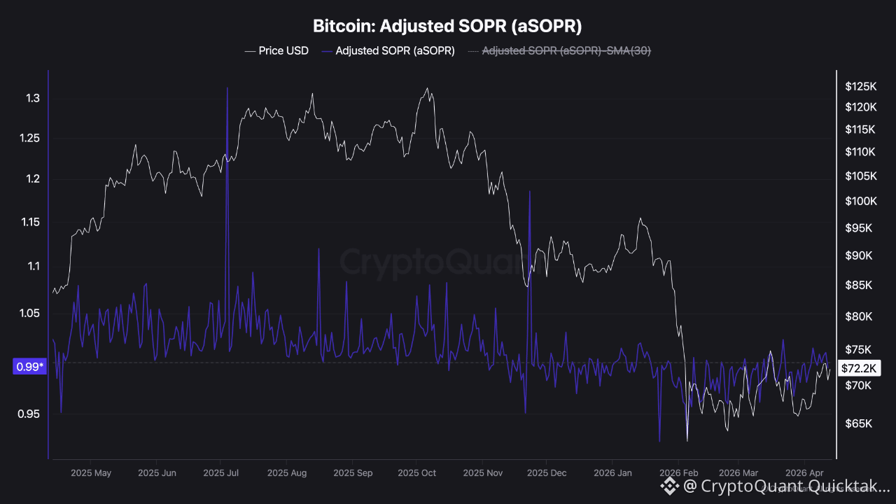 Bitcoin is still seeing selling. But not from a position of strength. aSOPR has spent 22 of the last 30 days below 1.0 and is back under break-even at 0.995. This is not a market distributing from a wide profit cushion. That cushion is already gone.