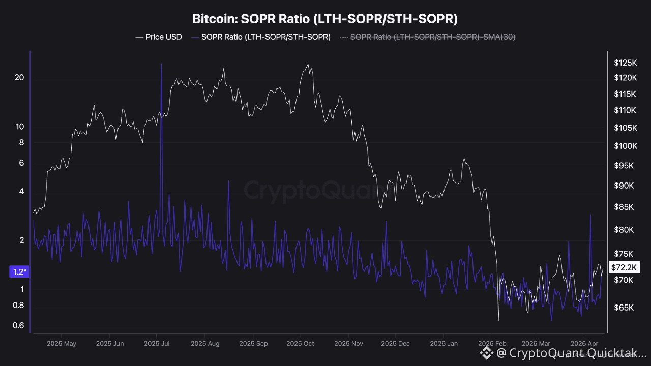 There was a sharp spike in the ratio on Apr 5. It did not hold. In the next 7 sessions, the ratio moved back below 1.0 on 6 of them before rebounding to 1.27. What matters is what did not happen. The market did not move into clean long-term holder distribution.