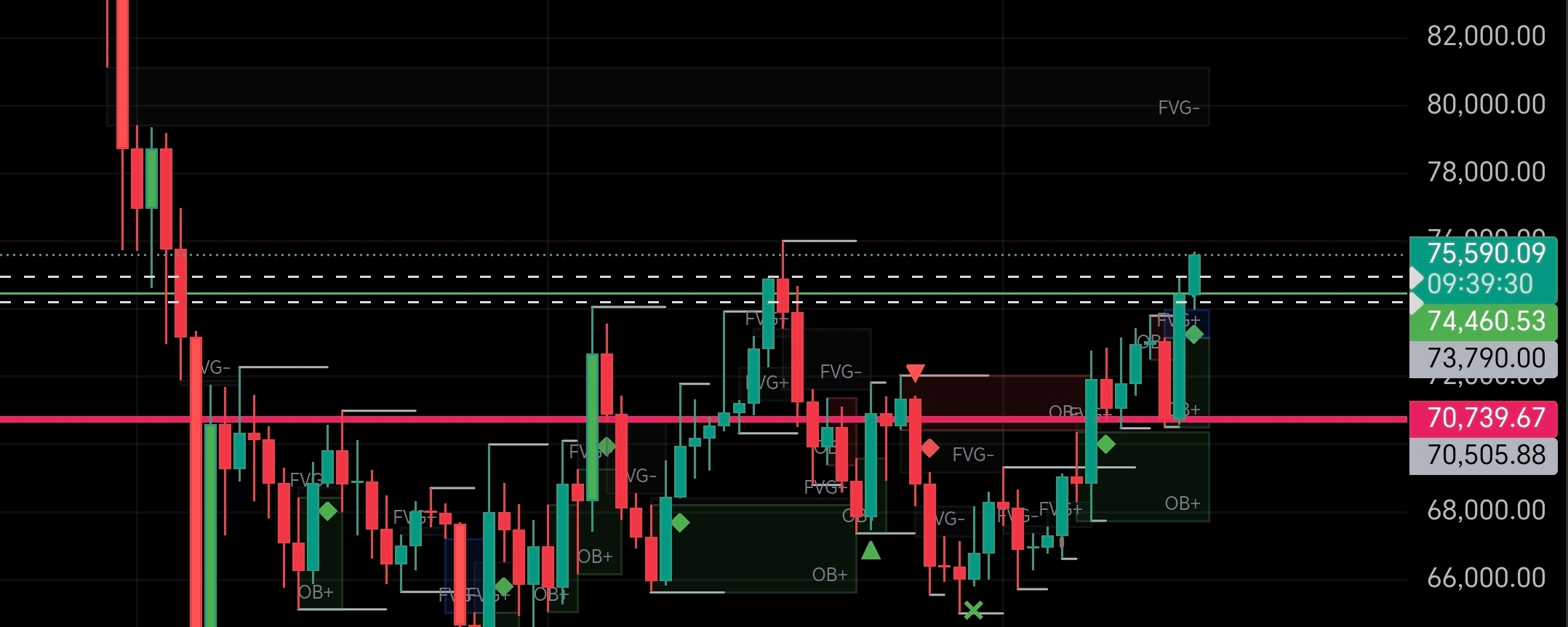 2. **وصل إلى 74,460** (منطقة شراء قوية = Order Block)