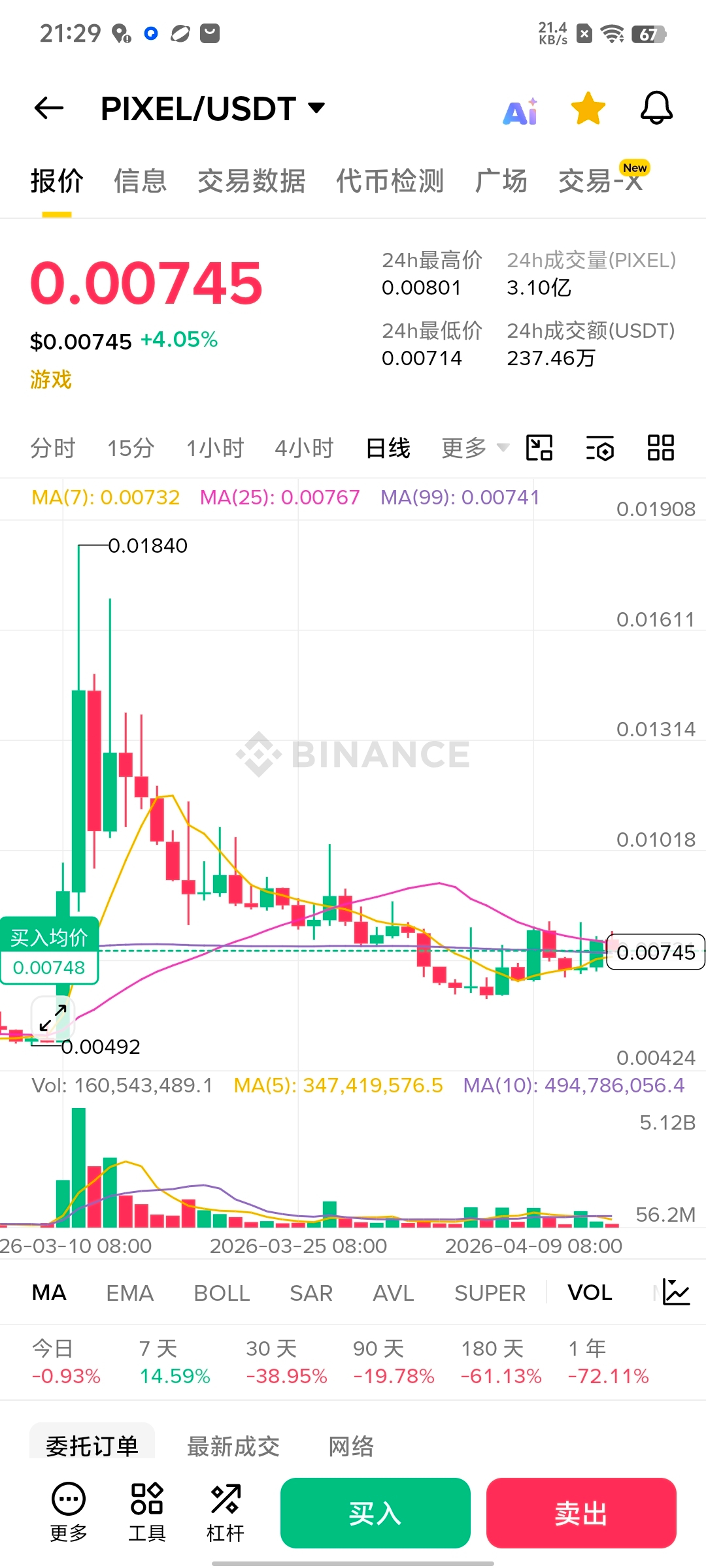 我会轻仓尝试买一点 $PIXEL 。理由有三个:日活 31 万在链游里属于头部;团队还在持续迭代,没有跑路;价格已经跌了 92%,向下空间有限,向上有转型预期。但我不会重仓,也不会长期质押。