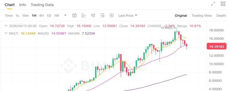 На текущий момент цена 14.29034 USDT, +30% за 24 часа. Объёмы торгов огромные, интерес рынка зашкаливает. Однако RSI (24h) на уровне 89.7 — это глубокая перекупленность. Такие значения часто предшествуют фиксации прибыли и резкой коррекции, особенно после вертикального пампа без значимых откатов.