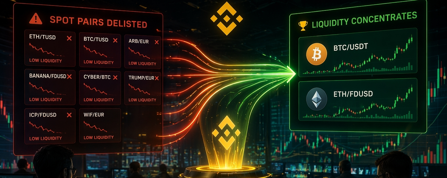 Binance anunció la eliminación de varios pares Spot, incluyendo ETH/TUSD, BTC/TUSD, ARB/EUR y otros, como parte de su política de revisión periódica. Aunque a simple vista parece una decisión operativa, en realidad refleja un fenómeno más profundo: la redistribución de liquidez dentro del ecosistema cripto.