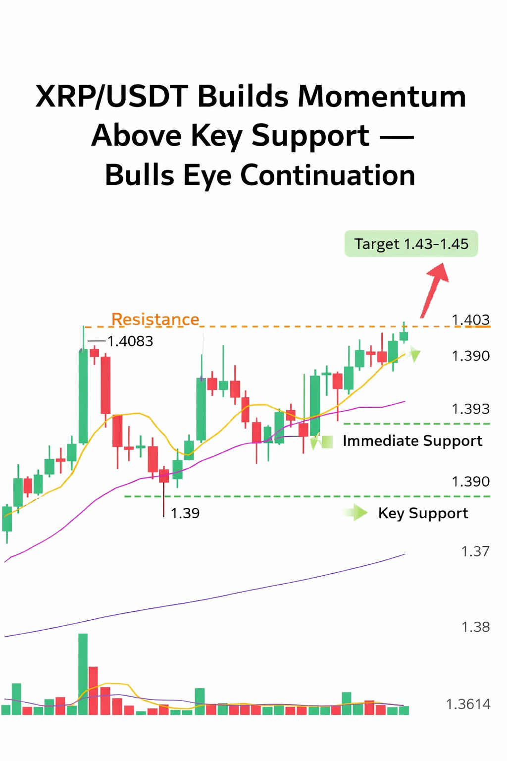 XRP/USDT is showing a steady bullish structure on the 15-minute timeframe, with price currently trading around 1.40 after a clean recovery from recent lows near 1.37.