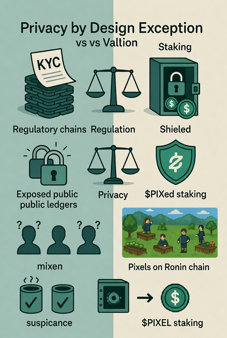 Privacy by design, starting from the staking layer outward, feels like a more grounded path. It doesn’t mean hiding everything that would be naive and probably illegal in many places. It means proving what regulators actually need (that you’re not a bad actor, that funds are legitimate, that settlement happened fairly) while letting normal human-scale activity stay efficient and less exposed. You stake to show commitment. The system can verify that commitment where required, but doesn’t force every harvest or small trade into a permanent spotlight.