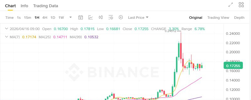 Рост выглядит импульсивным, вероятно, на новостях или листинге/хайпе в игровом/мемном секторе. Высокий RSI предупреждает: без свежих драйверов вероятна фиксация прибыли. Однако если монета удержит уровень выше 0.16–0.17 и объёмы не иссякнут, возможен дальнейший импульс к 0.20–0.25. При пробое вниз — быстрый откат к 0.14–0.12.