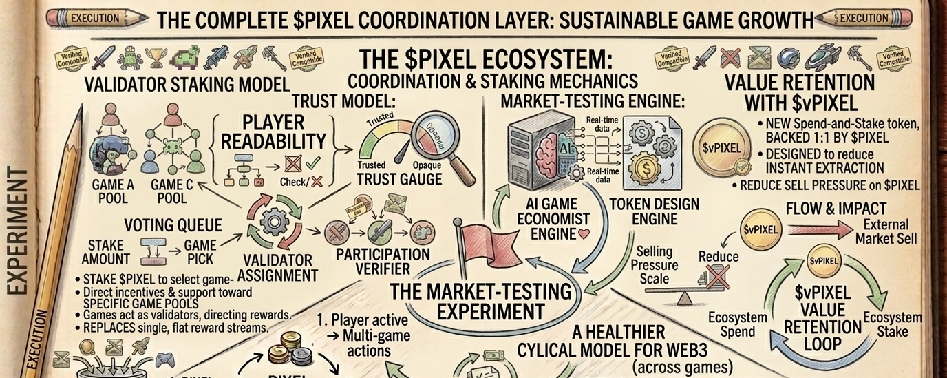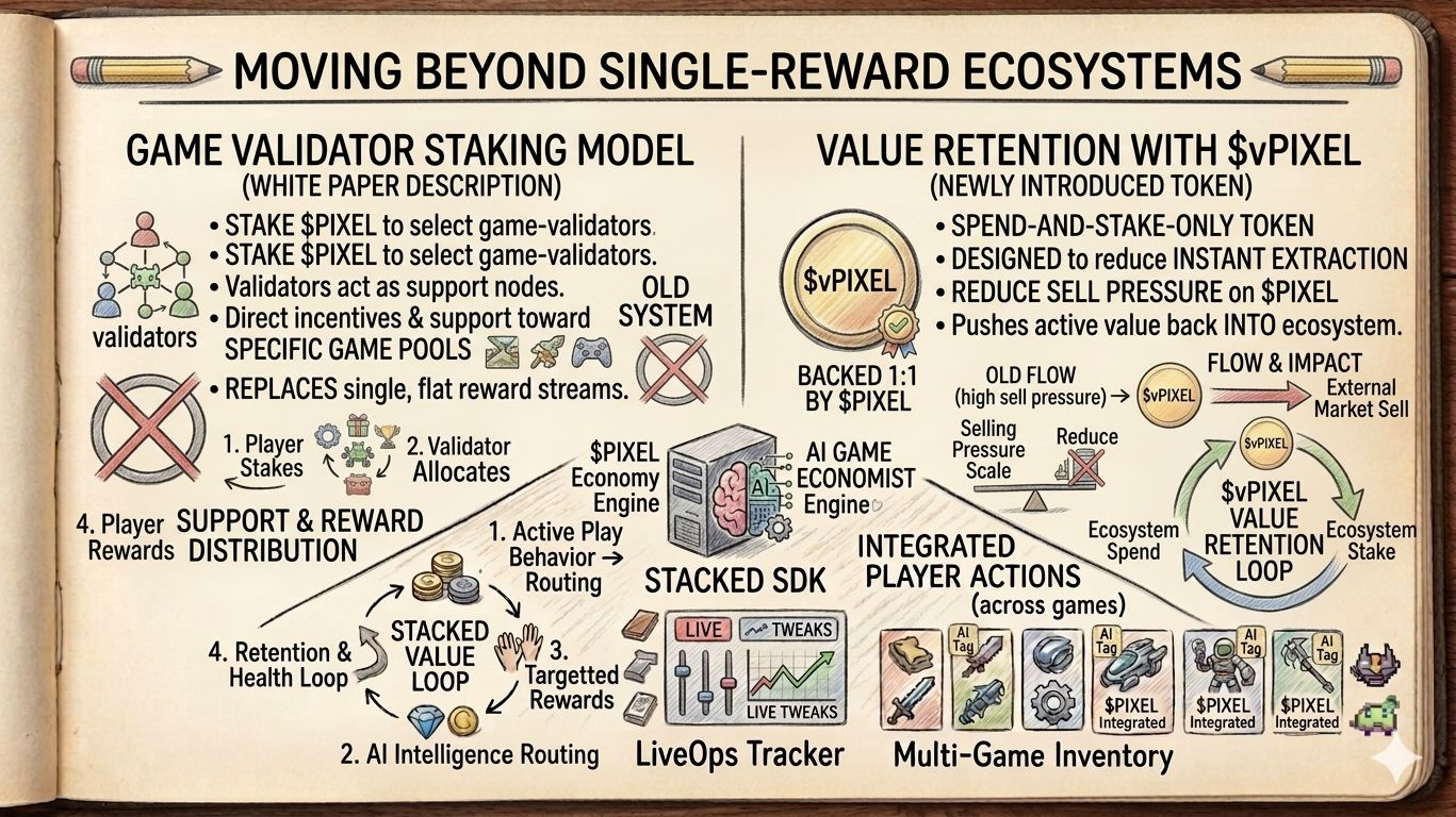 That is where the long-term case for $PIXEL starts to look stronger. Pixels’ whitepaper describes a staking model where games act like validators, letting stakers direct support and incentives toward specific game pools rather than treating the ecosystem like a single flat reward stream. On top of that, Pixels has introduced $vPIXEL as a spend-and-stake-only token backed 1:1 by $PIXEL, specifically to reduce instant extraction and sell pressure while keeping value active inside the ecosystem.