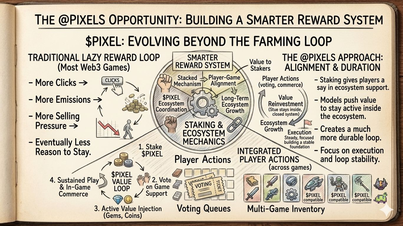 Most Web3 games still reward activity the lazy way. More clicks, more emissions, more selling pressure, and eventually less reason to stay. That is exactly why @Pixels has become more interesting to watch. The real story is no longer just the farming loop. It is the attempt to build a smarter reward system around Stacked and the wider $PIXEL ecosystem. Pixels’ own materials now frame the project as broader than a single game, with staking and ecosystem mechanics designed to align players and games more directly.