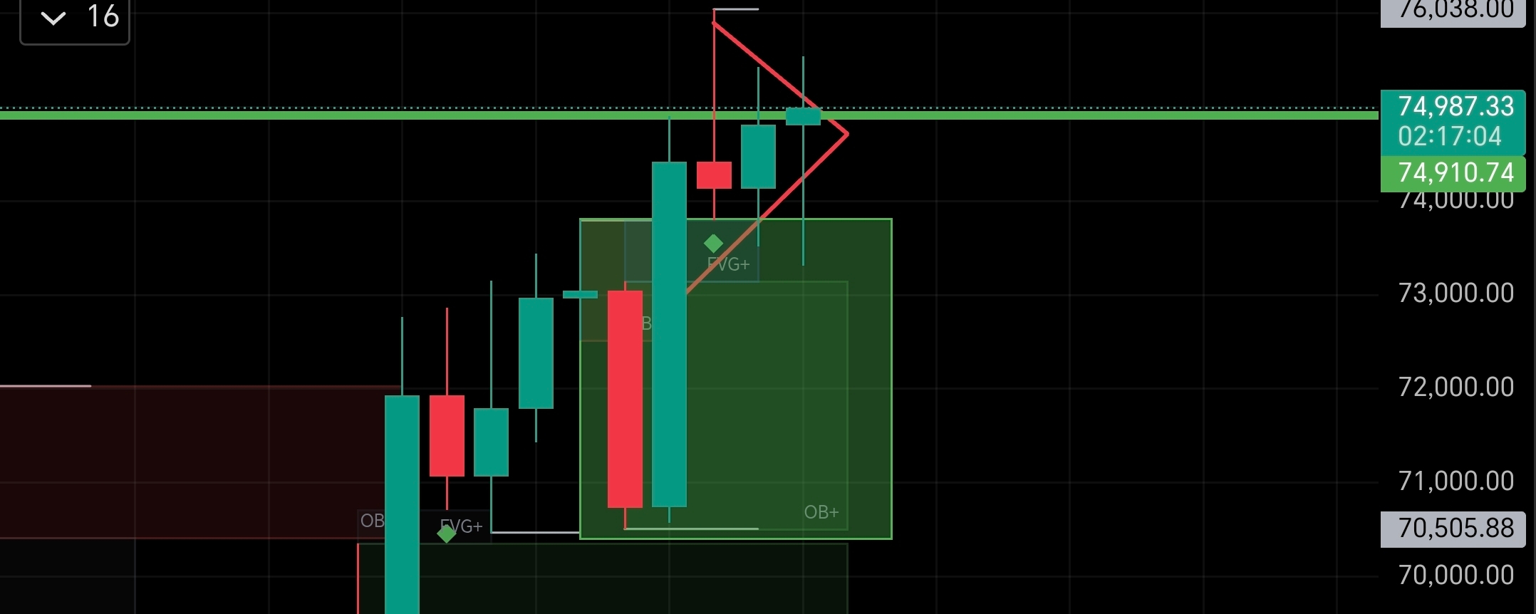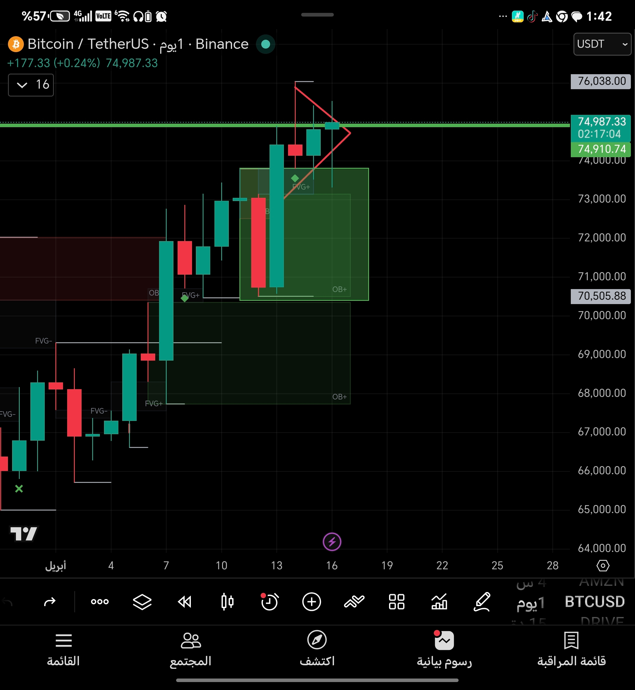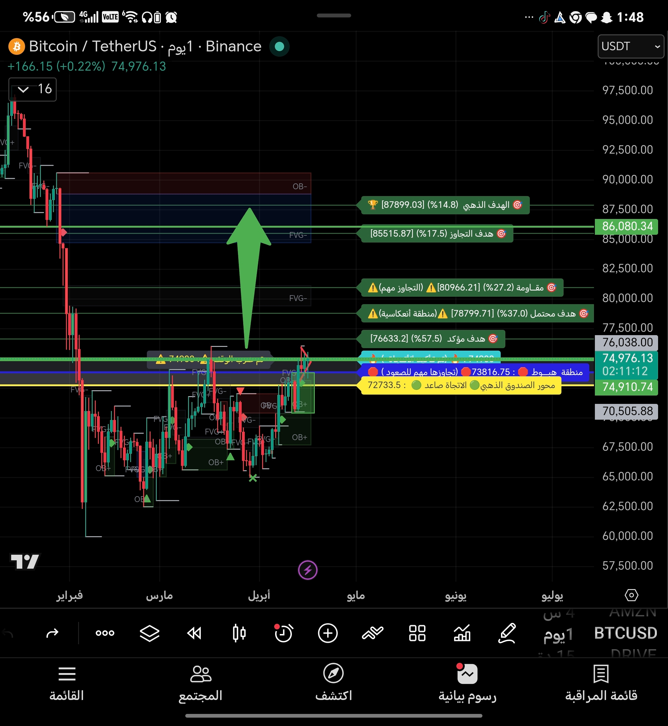 **الهدف الآن:** كسر **76,000-76,100** بـ Green candle قوية + إغلاق يومي = تأكيد الصعود ✅