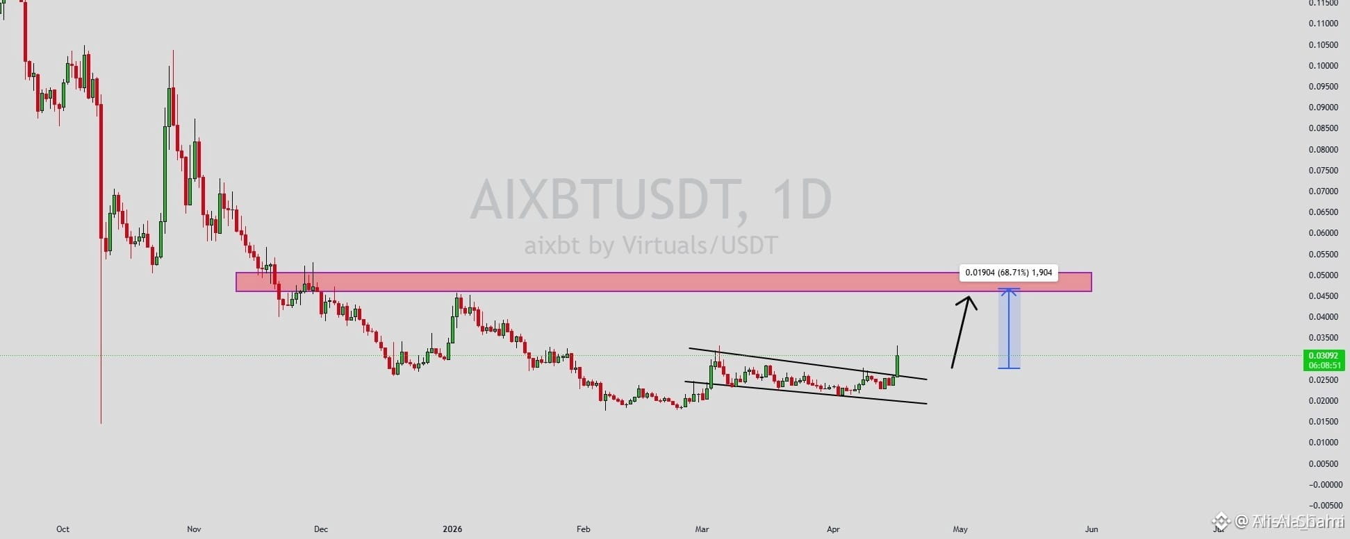 #AIXBTUSDT تشكل نمط موجة صعودي واضح، وهو إشارة عكسية صعودية كلاسيكية تشير غالبًا إلى اختراق قادم. السعر كان يتماسك ضمن نطاق ضيق، مما يشير إلى أن ضغط البيع يضعف بينما بدأ المشترون في استعادة السيطرة. مع حجم ثابت يؤكد التراكم عند مستويات أدنى، تشير الإعدادات إلى اختراق صعودي محتمل قريبًا. قد تؤدي الحركة المتوقعة إلى مكسب مثير للإعجاب يبلغ حوالي 50% إلى 60% بمجرد أن يكسر السعر فوق مقاومة الوتر.