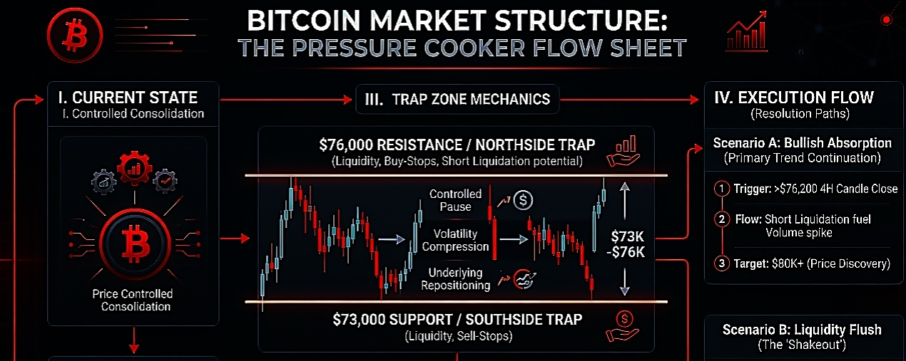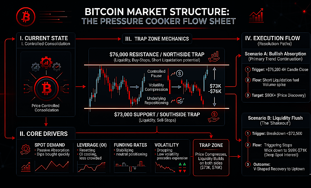 Price is still holding between roughly $73K–$76K, but what stands out is how clean the reactions are at both ends. Every dip toward the lower range gets bought relatively quickly, which suggests passive spot demand is active. At the same time, upside moves lose momentum near resistance, meaning supply hasn’t fully cleared yet.