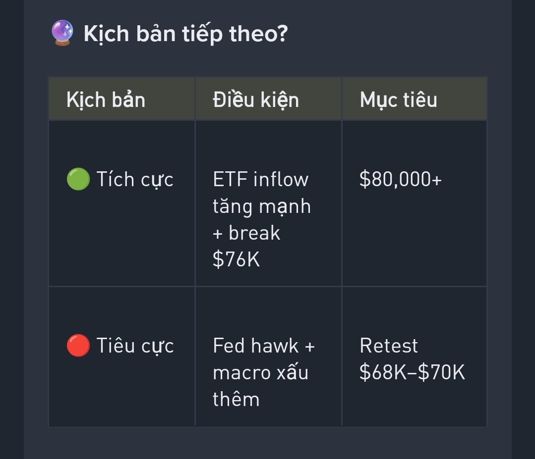 4. Kháng cự kỹ thuật tại $75K–$76K BTC liên tục thất bại khi thử phá $76,000. Cần một cây nến đóng cửa mạnh trên vùng này mới nhắm được $80,000.