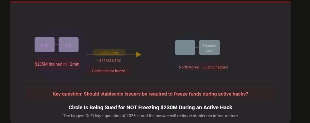Circle, the issuer behind USDC, is facing a class action lawsuit in Massachusetts tied to the $280 million Drift Protocol hack. The complaint alleges Circle did not take action to freeze stolen funds even though it had both the technical ability and contractual authority to do so. According to the lawsuit, attackers drained an estimated $280–$285 million from the Solana-based exchange in less than 12 minutes. The stolen assets were then moved from Solana to Ethereum over roughly eight hours using Circle's Cross-Chain Transfer Protocol.