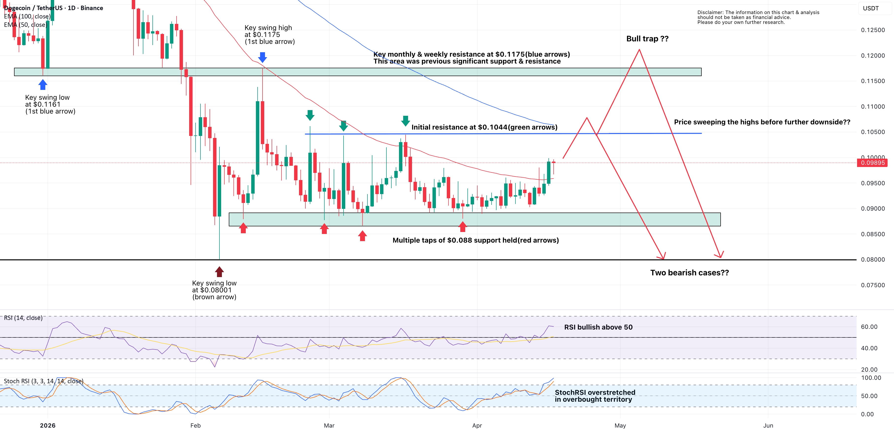 السعر يتحرك الآن إلى منطقة $0.104، وهو مستوى كان قد عمل سابقًا كمقاومة ويتماشى مع نقاط الرفض الأخيرة