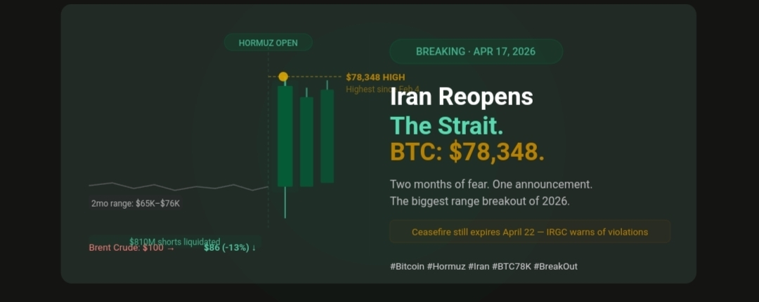 For two months, one question hung over every Bitcoin chart, every macro discussion, every trade: when does the Strait of Hormuz reopen?Yesterday, April 17, we got the answer.Iranian Foreign Minister Seyed Abbas Araghchi posted on X: "In line with the ceasefire in Lebanon, the passage for all commercial vessels through Strait of Hormuz is declared completely open for the remaining period of ceasefire." Bitcoin moved immediately — from $74,600 to above $76,000 within the hour.