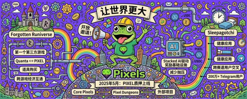 Pixels从一开始就是一款游戏,但它现在在做的事情,是把自己变成一个其他开发者可以在上面盖房子的地基。PIXEL质押系统在2025年5月上线的时候,同时支持的就不只是Pixels自己的核心游戏,而是Core Pixels、Pixel Dungeons、Forgotten Runiverse三款游戏,其中Forgotten Runiverse是第一个接入PIXEL的第三方游戏,这个信号很关键,它说明Pixels的开放邀请不只是说说,是有外部开发者愿意进来,把自己的游戏经济和PIXEL绑在一起。