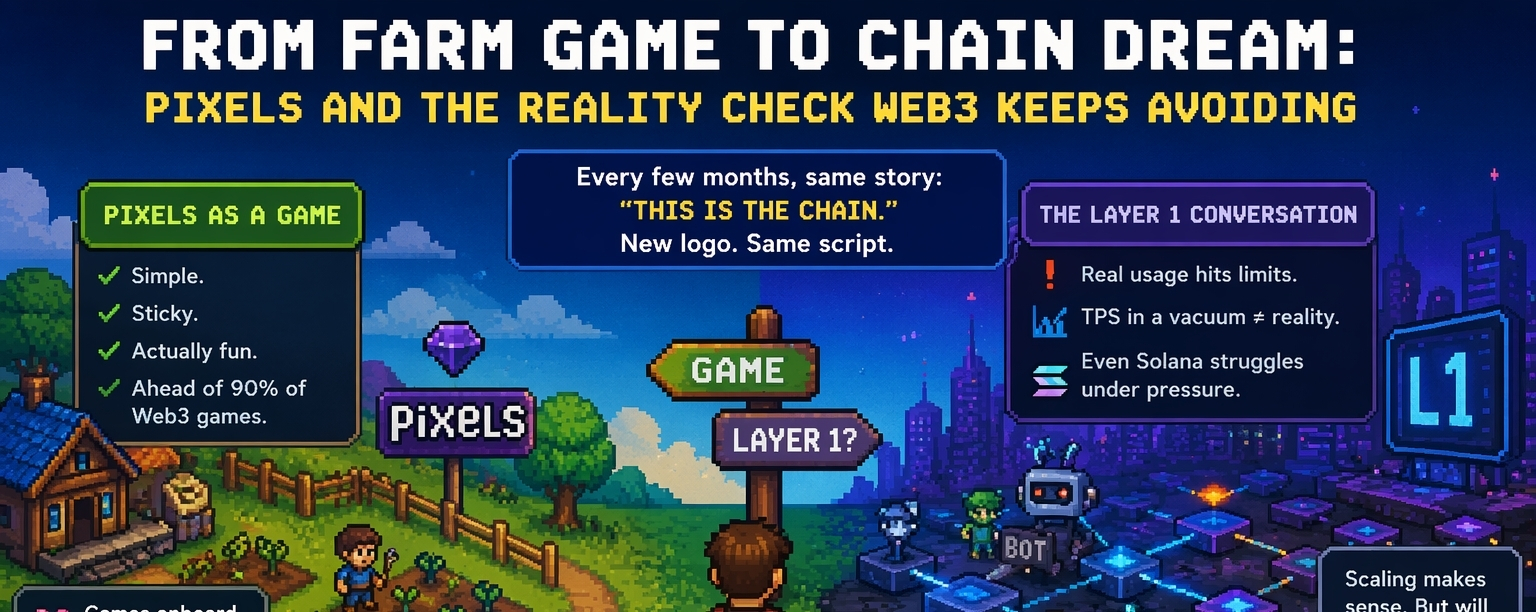 Don’t get me wrong, Pixels as a game makes sense. It’s simple, sticky, actually something people can spend time in without needing a PhD in tokenomics. That alone already puts it ahead of 90% of Web3 games that feel like spreadsheets pretending to be fun. But turning a game ecosystem into a Layer 1 story? That’s where my brain starts doing the slow sigh.