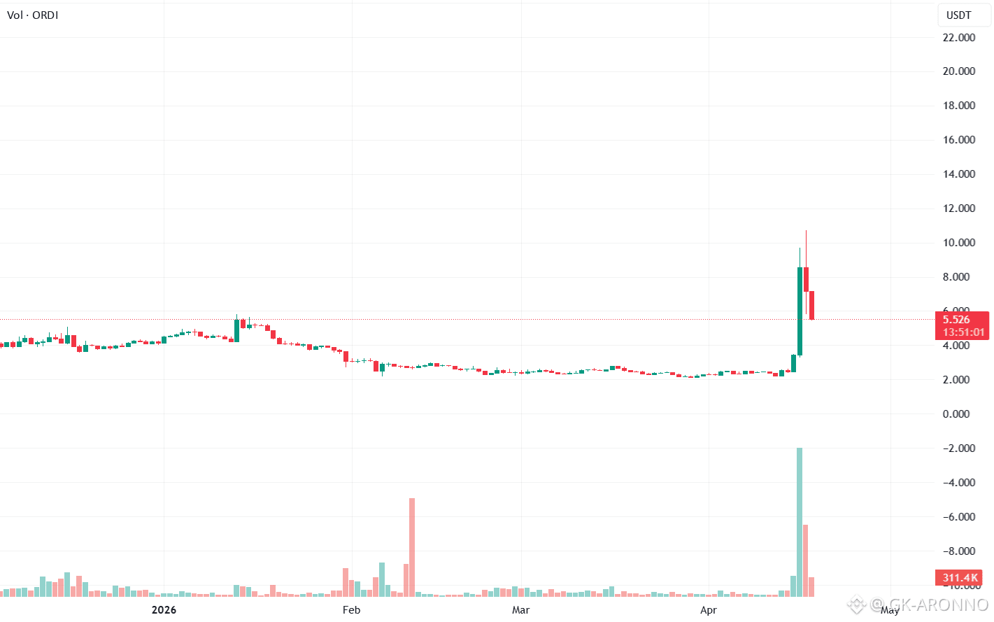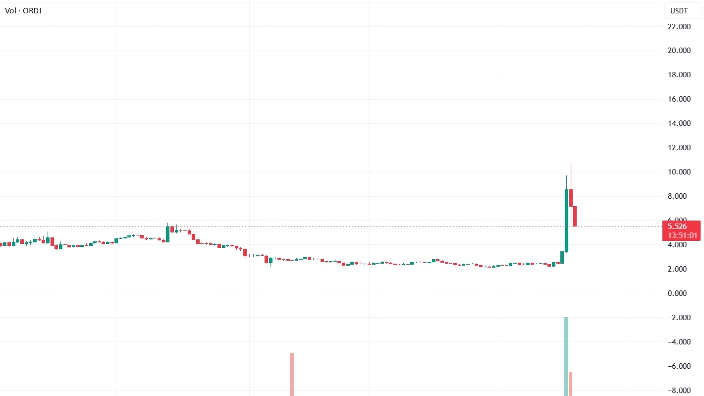 ORDIUSDT prints 5.550 spot against 5.517 futures with F/S ratio 28.22x↑ at 10.7% percentile V.High tag — leverage unwound to Floor band. Volumes pair 11.64M spot / 64.59M USDT versus 330.15M futures / 1.83M USDT — premium -0.59% Xtreme Backwardation at Z -3.7σ, yield Bull -651% APY at -3.7σ.
