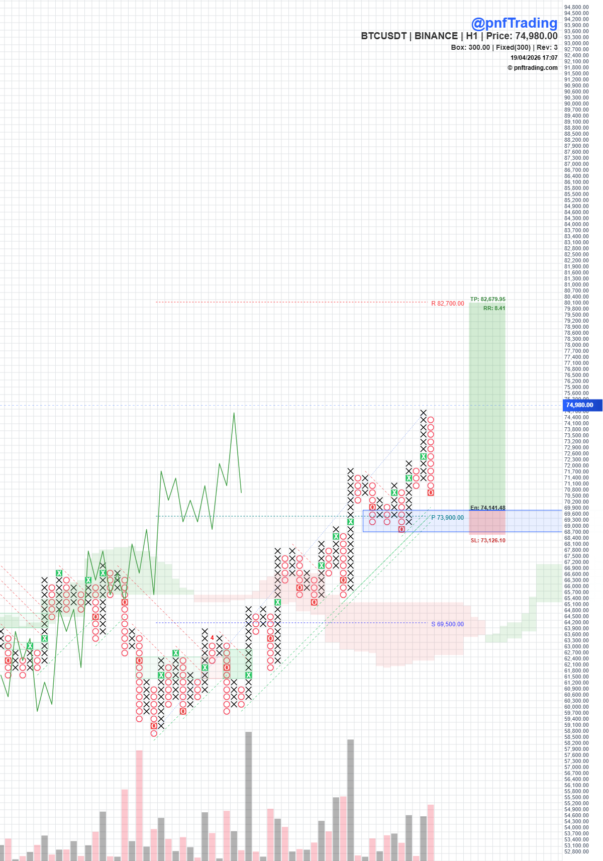 We have a BUY SIGNAL in play. You see, the lowest bar of the recent move was the week of Feb 2, 2026 (Low 59,930). The high of that bar was 79,301. We haven't taken that out yet. However, the immediate swing low was 64,955 (March 23). We have now exceeded the highs of the last four weeks.