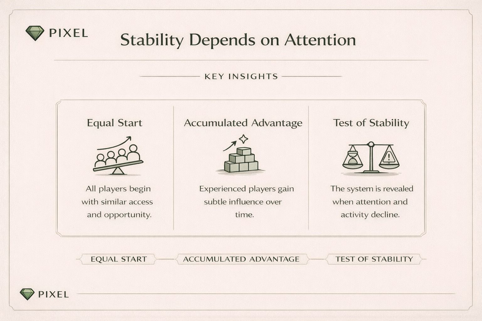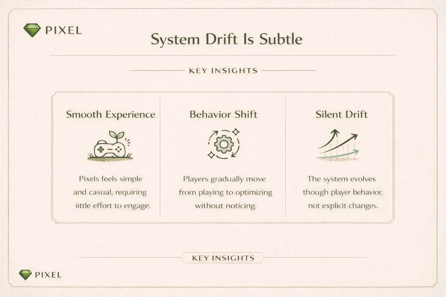 Có một khả năng là Pixels sẽ cứ chạy kiểu nhẹ nhàng như vậy. Người chơi vào, chơi casual, không cần quan tâm nhiều đến layer sâu hơn. Nếu giữ được vibe đó thì nó lại thành điểm mạnh. Nhưng cũng có một hướng khác, chậm hơn, khó thấy hơn. Là khi người chơi bắt đầu hiểu hệ thống không phải qua đọc docs, mà qua hành vi.