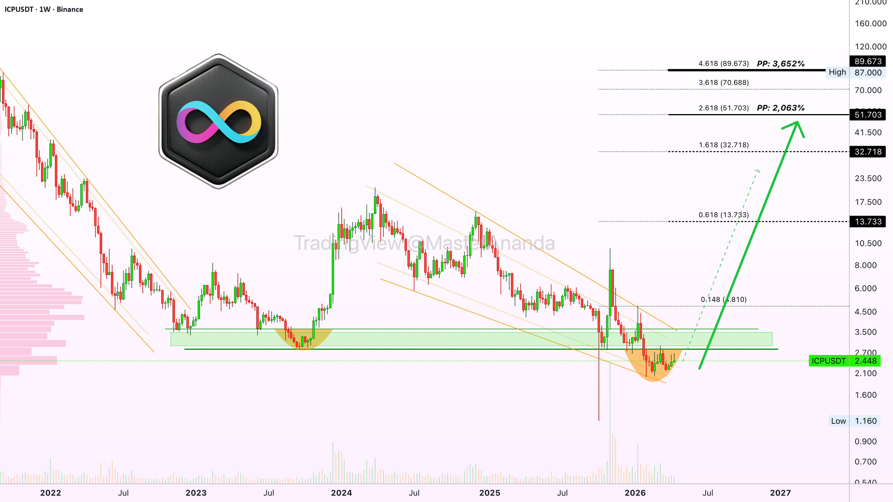 الرسم البياني هنا يظهر بداية دورة صاعدة جديدة. ICPUSDT سجل أدنى مستوى تاريخي جديد في أواخر العام الماضي وفي أوائل عام 2026 كان في عملية إنشاء نمط انتعاش - تغيير.
