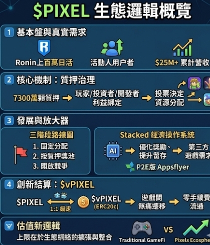 最後講 $vPIXEL。它 1:1 錨定 $PIXEL,用 ERC20c 做到跨遊戲流通而且零手續費,這一步非常關鍵:以前你在 A 遊戲賺到的價值,很難低摩擦帶到 B 遊戲;現在等於把流動性和使用權打通。當玩家資產能在多款遊戲間無痛遷移,代幣就從「某款遊戲點數」升級成「生態通用燃料」。所以我立場很明確:$PIXEL 真正的上限,不在單一爆款,而在它能不能持續把更多遊戲接進同一套質押治理加數據驅動分配加跨遊戲結算網路。這件事一旦跑順,#pixel 的估值邏輯就會和傳統 GameFi 完全不同。