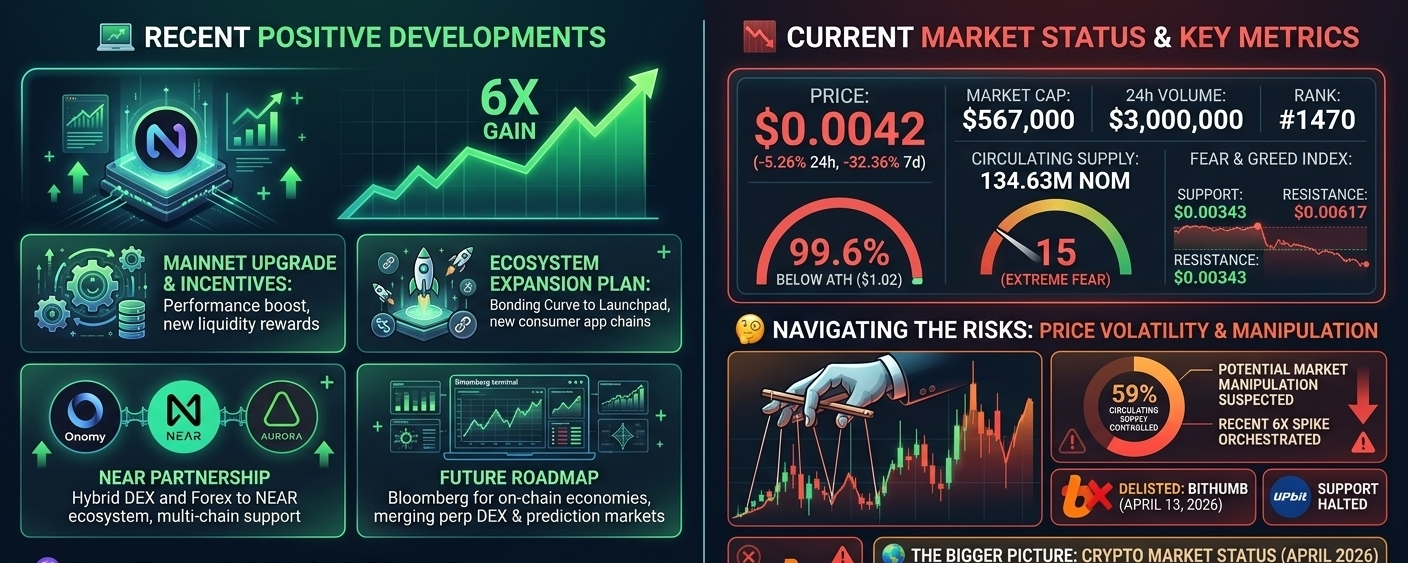 It's a very mixed picture for NOM right now. On one hand, there are positive updates, like a major protocol upgrade and a new roadmap for ecosystem growth. On the other, serious concerns around price volatility, exchange delistings, and even market manipulation allegations make it a high-risk asset.