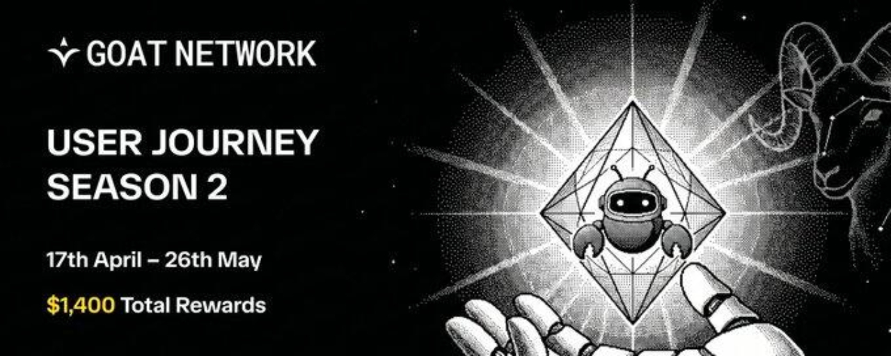 GOAT Network 刚刚启动了用户旅程第二季,时间从4月17日到5月26日,整整40天。不仅手把手带你玩转AI Agent,而且还有真金白银的奖励——总奖池1400美元。必须跟上啊!