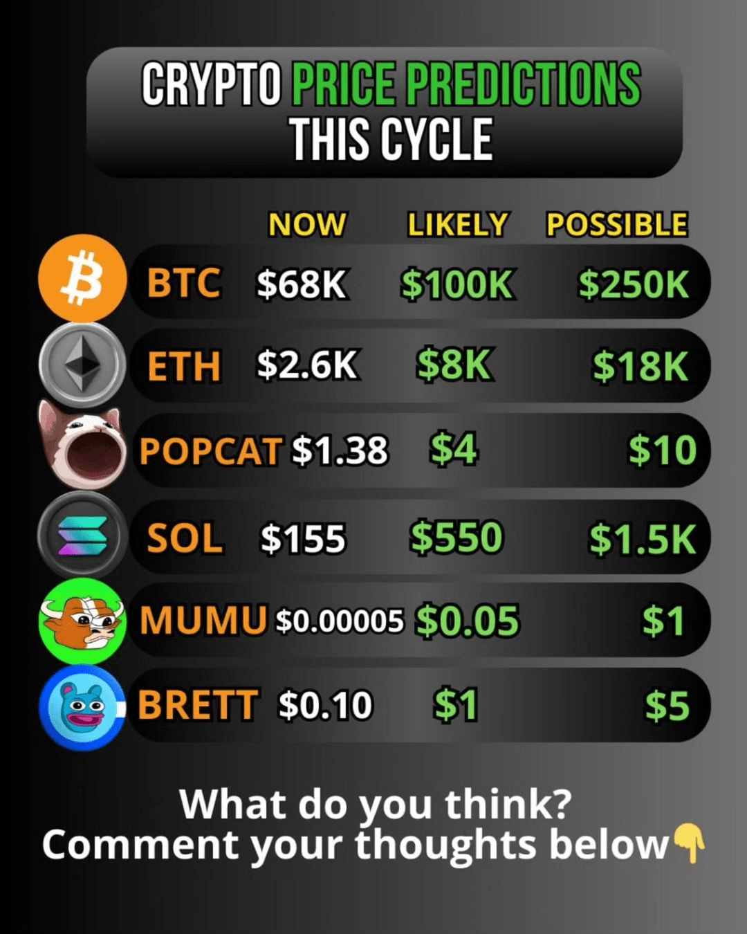 Und dann haben wir die Memecoins! Die virale Sensation Popcat reitet immer noch auf ihrer Hype-Welle, während Mumu, der Bulle, mit seiner starken bullischen Erzählung große Aufmerksamkeit erregt. Auch Brett sollte man nicht unterschätzen – es macht auf Meme-Seiten die Runde, und diese Token haben gezeigt, dass sie durch die Energie der Community in die Höhe schnellen können.