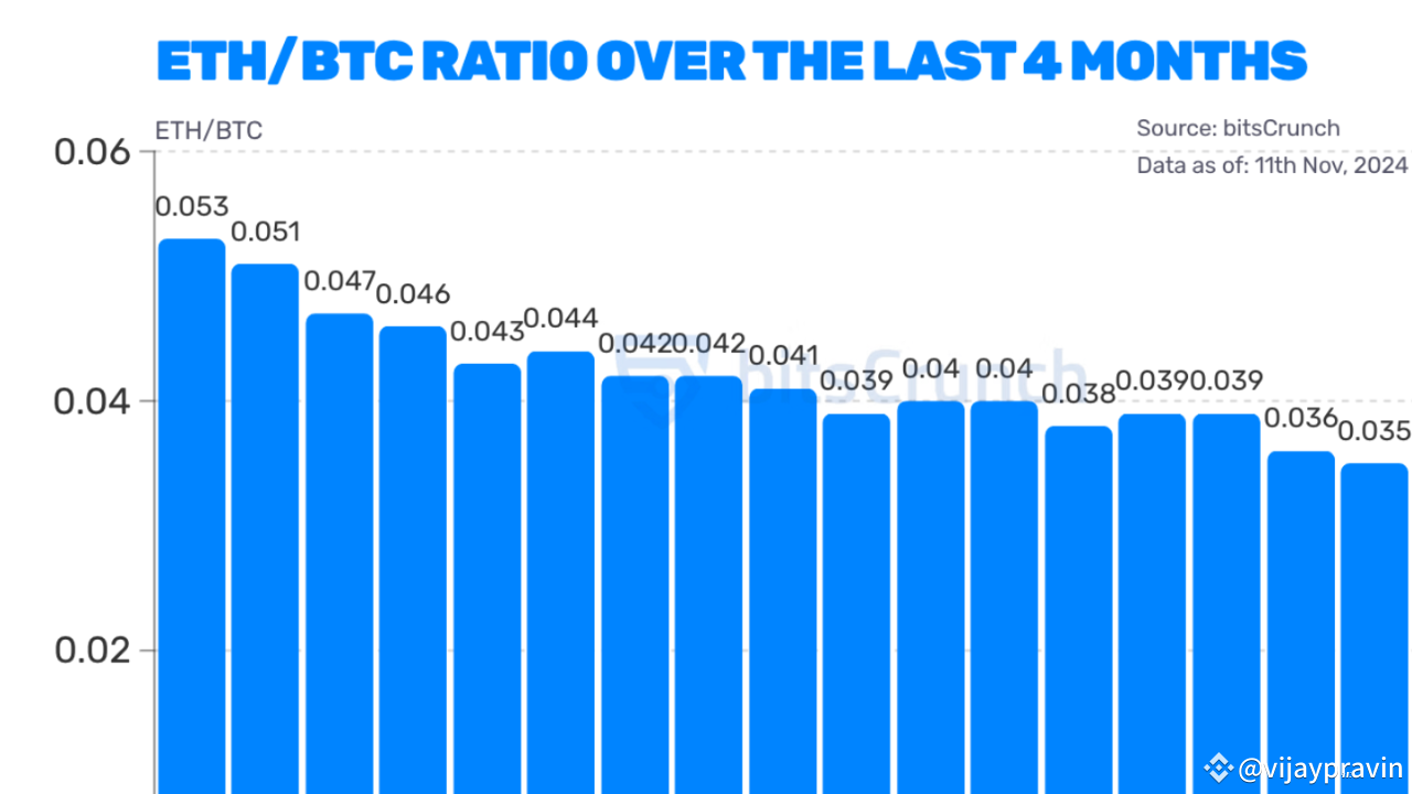 Das Verhältnis $ETH/$BTC liegt derzeit bei ~0,04, nahe dem historischen Tiefstand. In früheren Krypto-Bullenmärkten im Zyklus 2017/2021 erreichte dieses Verhältnis einen Höchststand von 0,08–0,12.Das ETH/BTC-Verhältnis erholt sich! In den vergangenen Bullenmärkten im Jahr 2021 und 2017 erreichte das ETH/BTC-Verhältnis etwa 0,05. Dieses Verhältnis gibt an, wie viele $BTC erforderlich sind, um 1 $ETH zu kaufen.