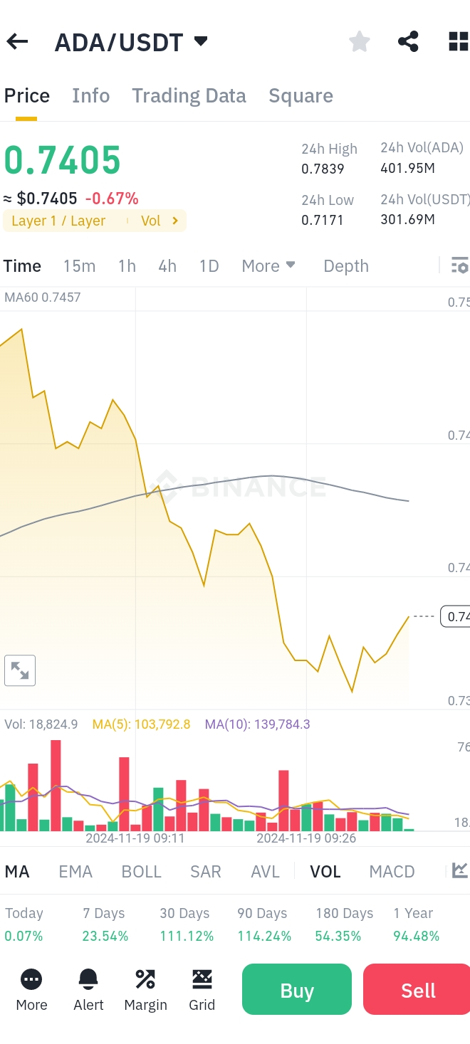 1. Preis: Der aktuelle Preis liegt bei $0.7405, leicht unter dem 60-Tage-Gleitenden Durchschnitt (MA60) bei $0.7457, was auf eine bärische Stimmung im kurzfristigen bis mittelfristigen Bereich hinweist.