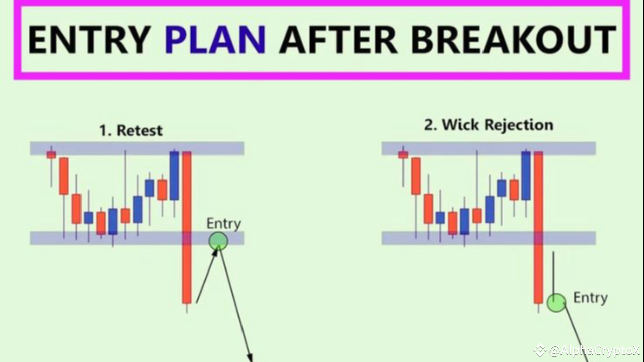 In der volatilen Welt des Tradings sind Ausbrüche aufregende Momente, in denen der Markt entschlossen handelt. Die echte Herausforderung liegt jedoch darin, zu verstehen, wie man nach einem Ausbruch in einen Trade einsteigt – eine Fähigkeit, die erfahrene Trader von Anfängern trennt. Das obige Diagramm veranschaulicht vier kraftvolle Einstiegsstrategien nach einem Ausbruch, die darauf ausgelegt sind, dein Gewinnpotenzial zu maximieren und gleichzeitig das Risiko zu minimieren.