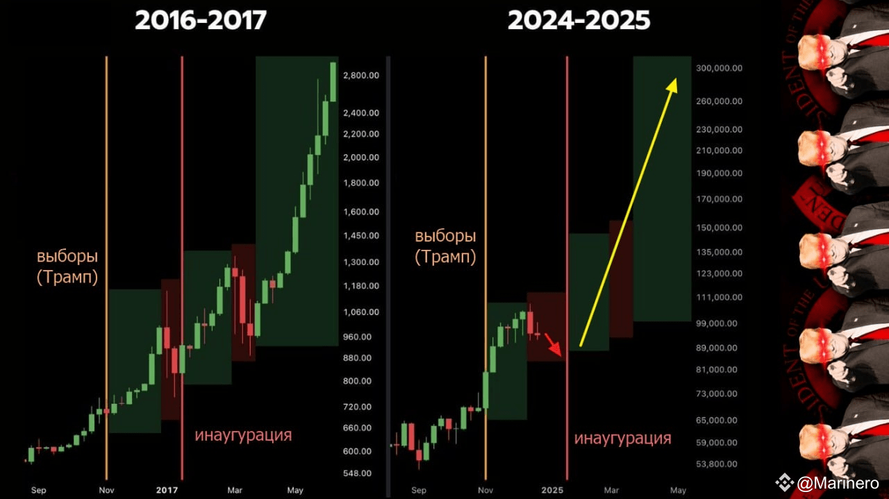 In den Jahren 2016-2017, als Trump die US-Wahlen gewann, stieg BTC unmittelbar nach den Wahlen zunächst an, korrigierte dann vor der Amtseinführung und ging schließlich zum Mond.