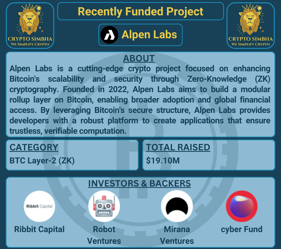 🔹Über: Alpen Labs konzentrierte sich darauf, die Skalierbarkeit und Sicherheit von Bitcoin durch Zero-Knowledge (ZK)-Kryptografie zu verbessern. Alpen Labs wurde 2022 gegründet und zielt darauf ab, eine modulare Rollup-Schicht auf Bitcoin aufzubauen, die eine breitere Akzeptanz und einen globalen Finanzzugang ermöglicht. Durch die Nutzung der sicheren Struktur von Bitcoin bietet Alpen Labs Entwicklern eine robuste Plattform zur Erstellung von Anwendungen, die eine vertrauenslose, überprüfbare Berechnung gewährleisten. Das Projekt hat kürzlich 8,50 Millionen US-Dollar in einer strategischen Finanzierungsrunde unter der Leitung von Cyber Fund, DBA, Ribbit Capital und weiteren Investoren wie Mirana Ventures und Castle Island Ventures eingesammelt. Der innovative Ansatz von Alpen Labs unterstreicht die Bedeutung von Einfachheit und Vertrauen in Umgebungen mit hohem Einsatz und trägt zu einer integrativen finanziellen Zukunft bei. Mit einem Team engagierter Fachleute ist Alpen Labs bereit, die Blockchain-Landschaft zu revolutionieren und die individuelle Finanzkompetenz zu erweitern.🚀🌐