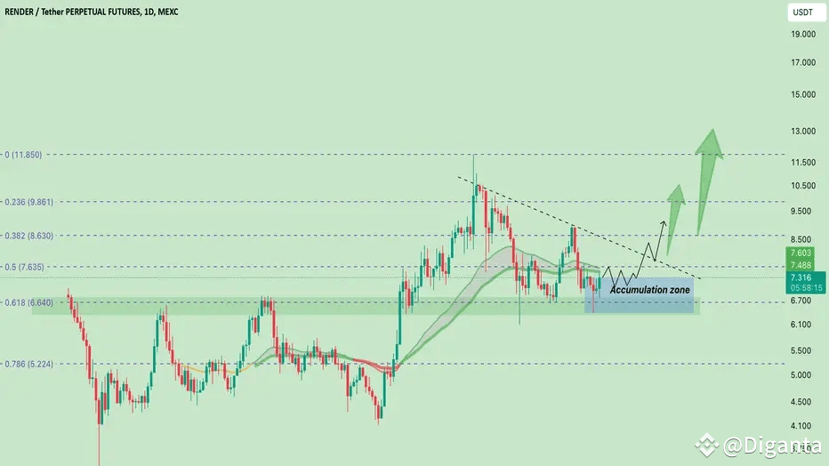 RENDER sieht im Moment sehr interessant aus! 👀 Es konsolidiert sich in einem engen Bereich zwischen 6,60 und 7,40 $, was eine klassische Akkumulationsphase sein könnte. Stellen Sie es sich wie eine Rakete vor dem Abheben vor! 🚀