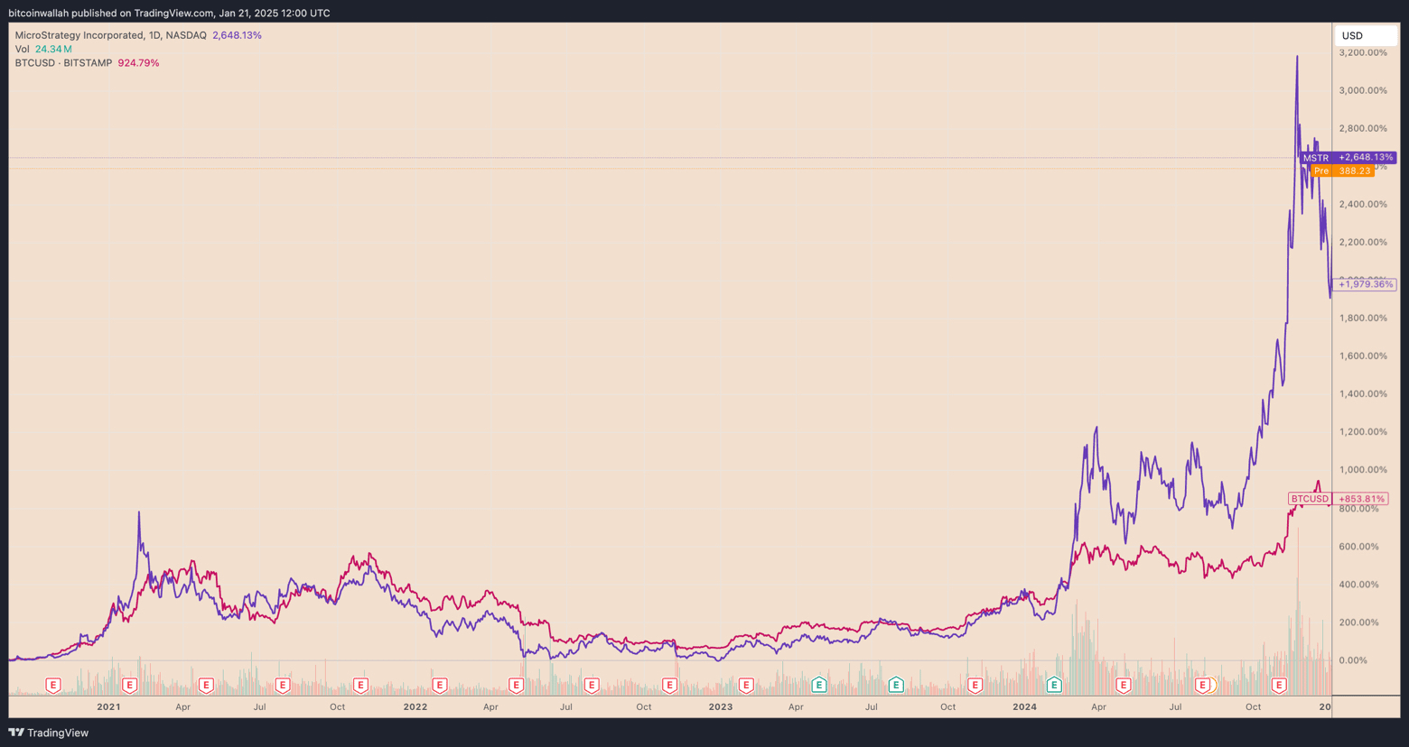 Und hier ist der Knaller: Der Aktienkurs von MicroStrategy ist um beeindruckende 2.650 % gestiegen, seit das Unternehmen Bitcoin kauft, was den Bitcoin-Anstieg von 850 % im selben Zeitraum übertrifft. Die Investoren sehen Bitcoin-gestützte Unternehmen eindeutig als Goldgruben.