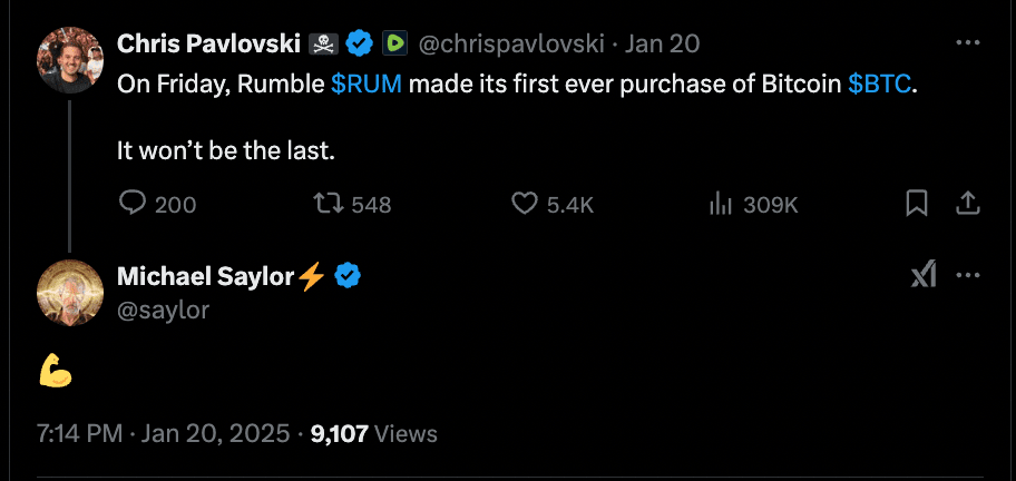 Am 20. Januar schockierte Rumble Inc. ($RUM) die Finanzwelt, indem es seinen ersten Bitcoin-Kauf ankündigte, rechtzeitig zur historischen Rückkehr von Donald Trump als 47. Präsident der Vereinigten Staaten. Die Video-Sharing-Plattform gab bekannt, dass dies erst der Anfang ihrer Bitcoin-Reise ist und damit den Weg für einen neuen Unternehmens-Trend ebnet: #BuyBitcoin, lass deine Aktien steigen.