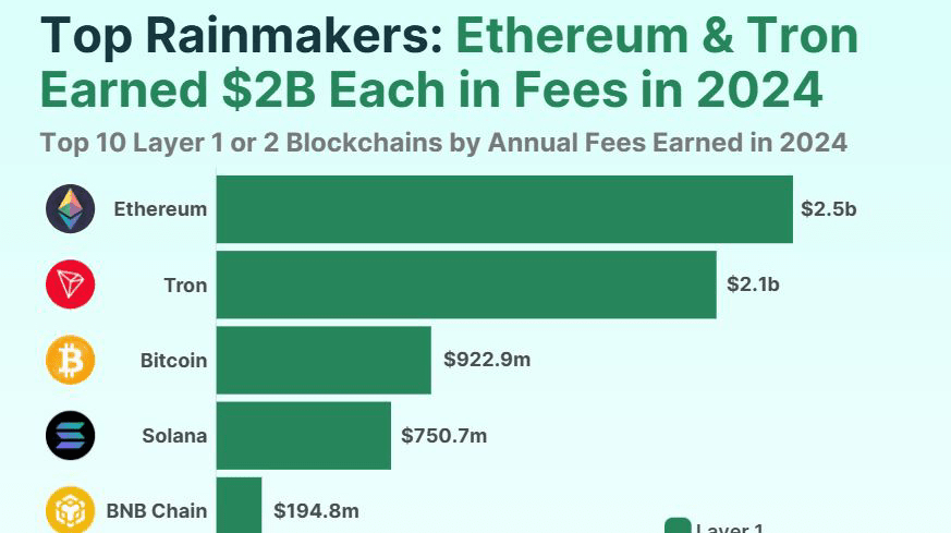 Bitcoin erlebte ebenfalls ein Wachstum und erhöhte seine jährlichen Gebühreneinnahmen im Jahr 2024 um 16 % im Vergleich zu 2023.