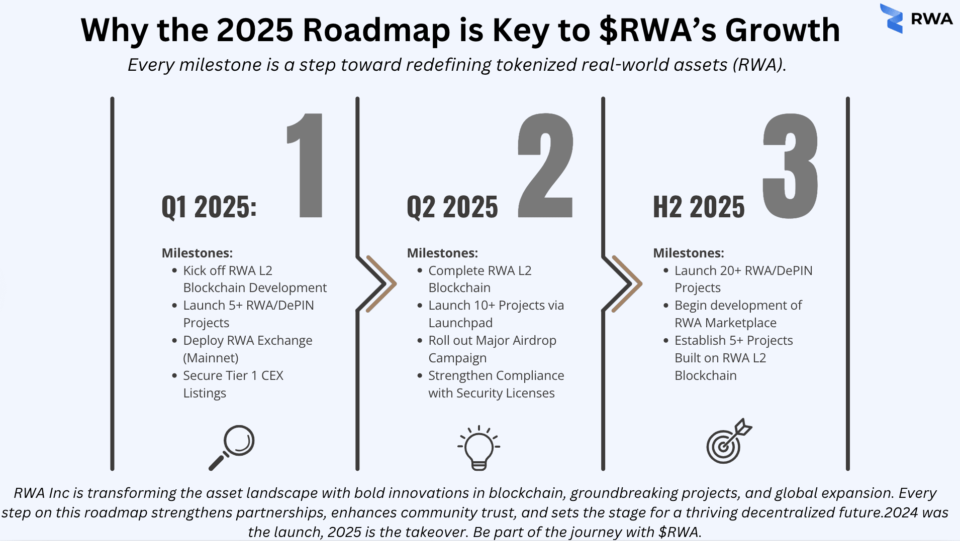 Große Dinge passieren bei RWA Inc. Ihr ehrgeiziger Fahrplan für 2025 legt eine mutige Vision für den Ausbau von Partnerschaften, die Einführung von Produkten und die Stärkung der Gemeinschaft dar. Lassen Sie uns das aufschlüsseln, damit Sie sehen können, warum $RWA bereit ist, die Zukunft der tokenisierten realen Vermögenswerte zu führen.