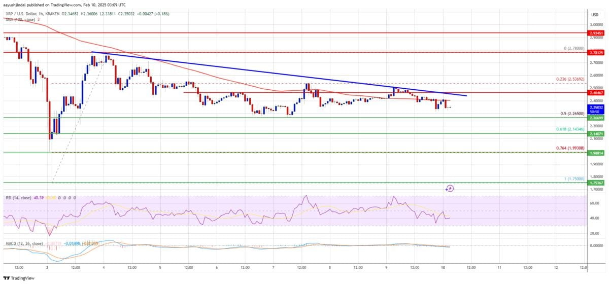 Der Preis wird jetzt unter 2,50 $ und dem 100-stündigen einfachen gleitenden Durchschnitt gehandelt. Auf der Oberseite könnte der Preis auf Widerstand in der Nähe des Niveaus von 2,450 $ stoßen. Es bildet sich auch eine verbindende bärische Trendlinie mit Widerstand bei 2,4650 $ im Stundenchart des XRP/USD-Paares.