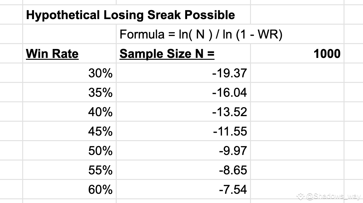 Die Tabelle unten zeigt die potenziell maximalen Verlustserien basierend auf unterschiedlichen Gewinnraten über 1.000 Trades. Selbst bei einer Gewinnrate von 60% ist eine Serie von ~7 Niederlagen in Folge statistisch möglich!