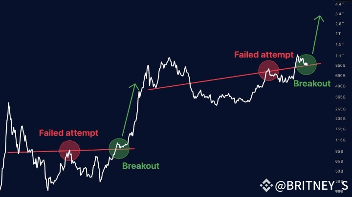 In der Vergangenheit hat der Markt versucht, diese Widerstandslinie zu durchbrechen, aber ist gescheitert. Dies ist eine klassische Situation, in der der Markt versucht, durchzubrechen, aber von der *Bitcoin-Dominanz* oder Marktangst zurückgehalten wird. Viele Leute dachten, Altcoins seien in diesen Phasen *tot*, und der Markt erlebte große Rückgänge. 🛑
