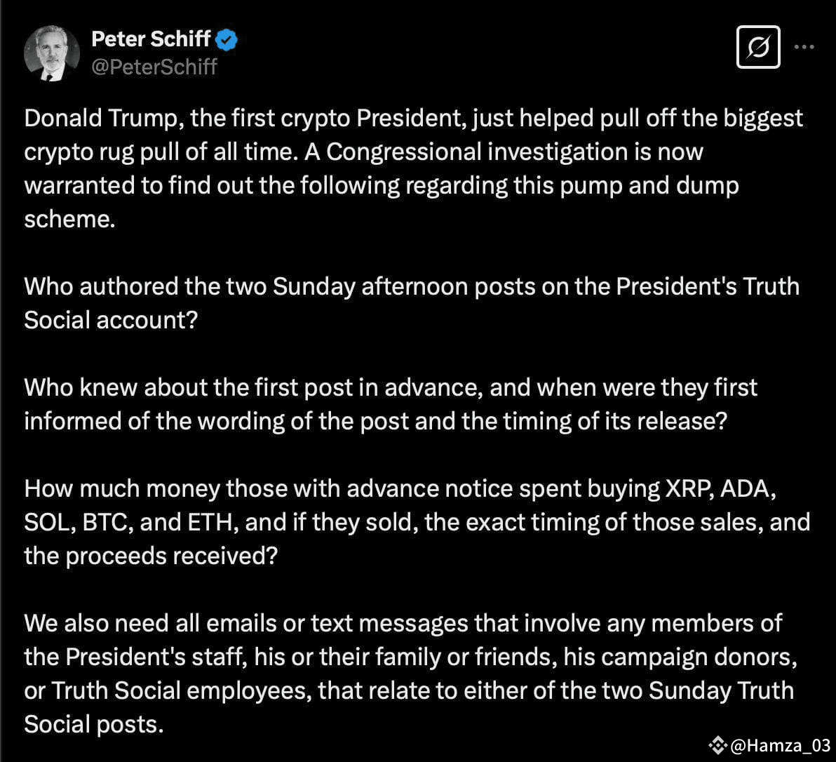 In dem, was der hochkarätigste Fall von Finanzbetrug in der modernen Geschichte sein könnte, wird Donald Trump, der erste "Krypto-Präsident", beschuldigt, ein massives Pump-and-Dump-System orchestriert zu haben, indem er seinen Einfluss und Online-Plattformen nutzte. Der renommierte Finanzanalyst Peter Schiff hat eine Kongressuntersuchung zu den angeblichen Marktmanipulationen gefordert, die Insidern – einschließlich Trumps Familie, Mitarbeitern, Geschäftspartnern und Wahlspendern – zugutekommen könnten, auf Kosten ahnungsloser Privatanleger.