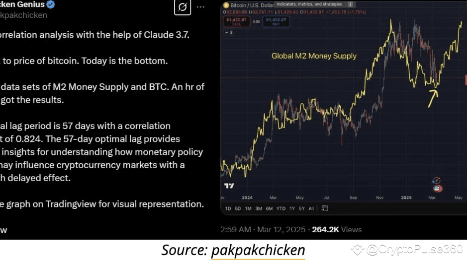 Bitcoin hat eine 82%ige Korrelation mit der globalen M2-Geldmenge gezeigt, laut Analyst Pakpakchicken. Dies deutet darauf hin, dass die Preisbewegungen von Bitcoin stark von den globalen Liquiditätsbedingungen beeinflusst werden.